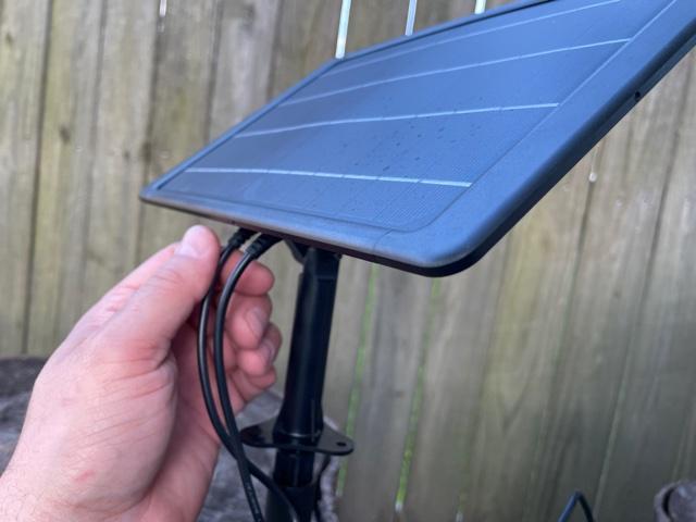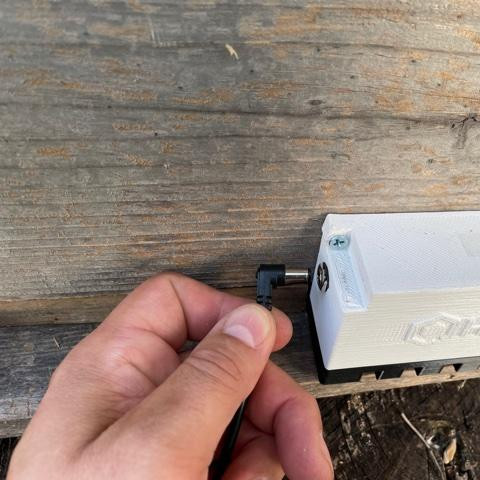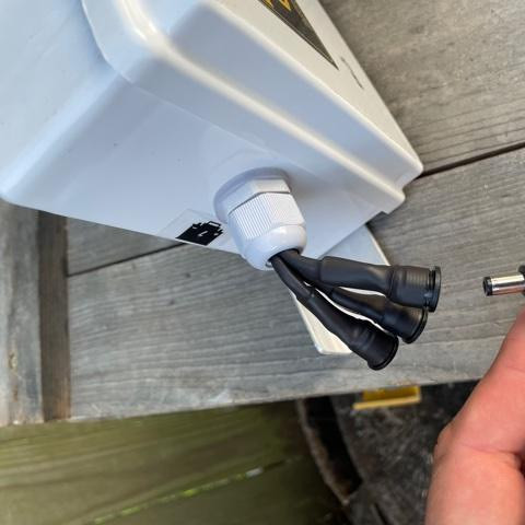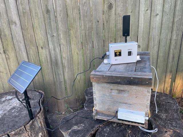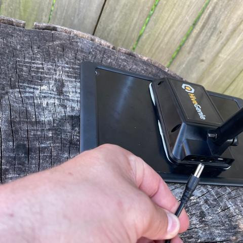 8. Place your solar panel and battery in a convenient location; we usually do it on top of the hive for an unobstructed view of the sun using wood screws or you can stake it to the ground. The solar panel should be facing south (if you live north of the Equator). Set the solar panel at the appropriate angle, roughly at the latitude of your location; be careful to point the connector openings downwards to prevent rain from getting in.
