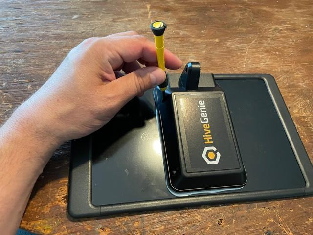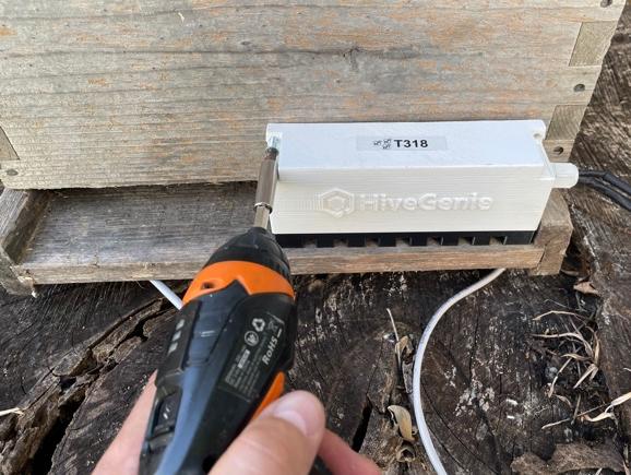 5. Screw the antenna into your Hive Genie gateway(Big Box, for LTE units only, wifi and offline units don’t have an antenna). Use two wood screws to attach your HiveGenie gateway to your Brood box.