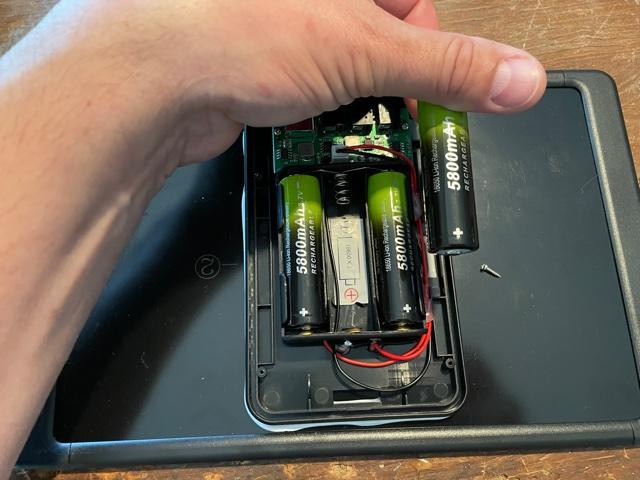 6. Open the battery case behind the solar panel using a #1 Phillips screwdriver. Insert three 18650 Lithium-Ion batteries, be careful to align them properly according to the diagrams, flat (negative) side pointing towards the spring. Close the solar panel.