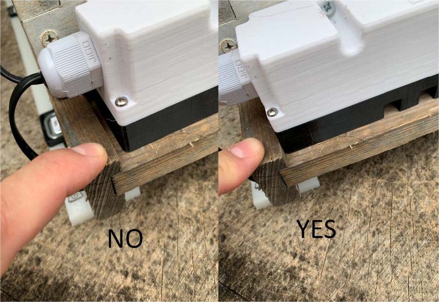 4. Place the photogates in front of the hive entrance and block the rest of the entrance with a piece of wood, such as a cut entrance reducer. Then secure photogates with two wood screws, otherwise bees will push it out. It is better if you screw the photogates to the brood box so bees don’t move it. Block the rest of the entrance with a piece of wood. Make sure there are no holes for the bees to cheat.