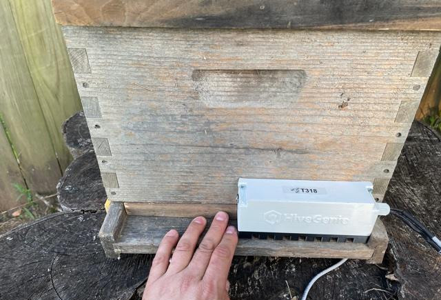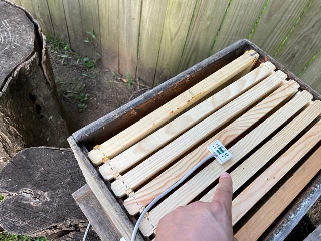 3. Place the Sniffer (temperature, relative humidity, carbon dioxide, and volatile organic carbon sensory array) between frames five and six, on the top of the brood box. Close the hive, if the cover doesn’t close, readjust the sensor sideways between frames, this is not a problem if you have a second box on top.